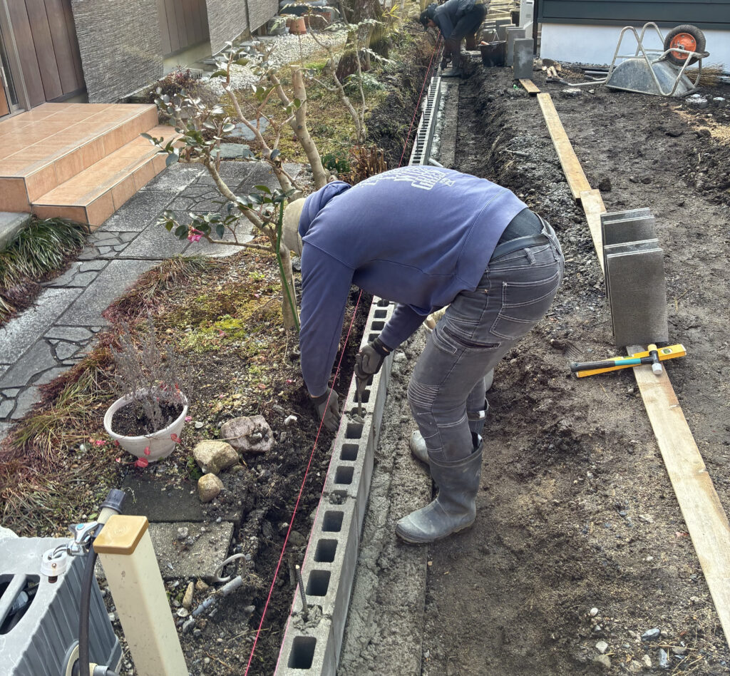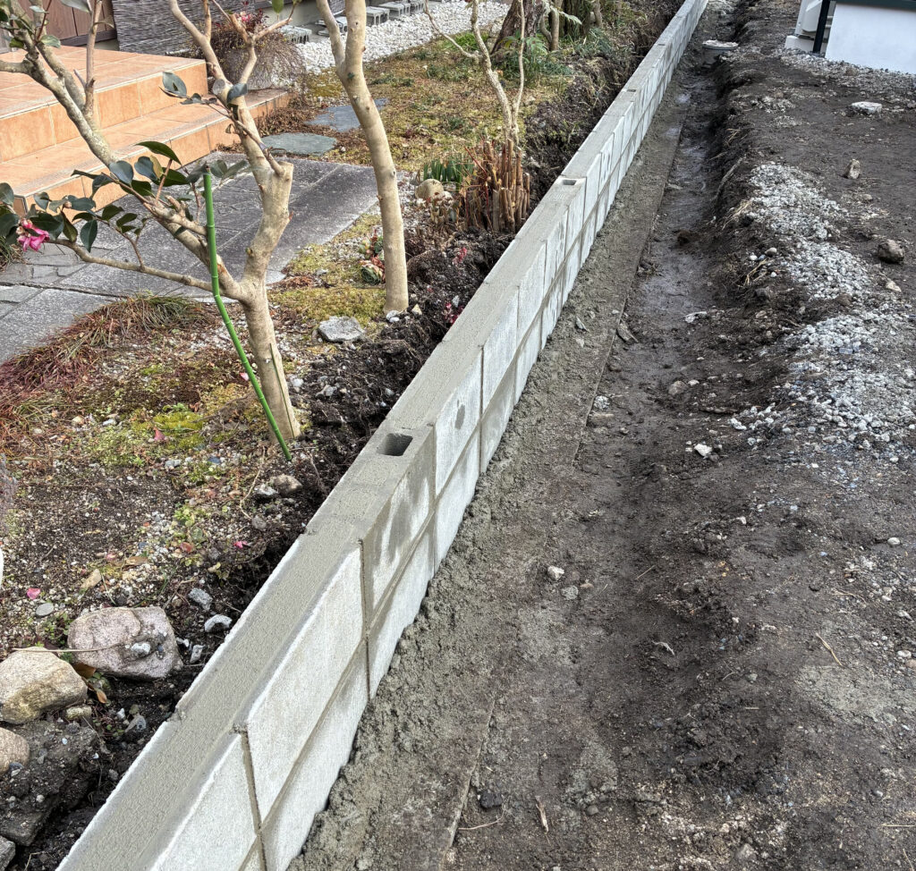 土を掘ってブロックの基礎となるコンクリートを流し込みます。しっかりと水平になる基礎を作り、その上にブロックを積んでいきます。ひとつずつ水平、通りを確かめながら地道な作業になりますが、人にしかできない大切な作業です。