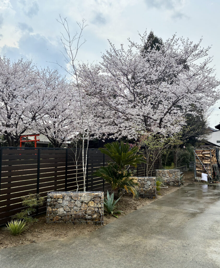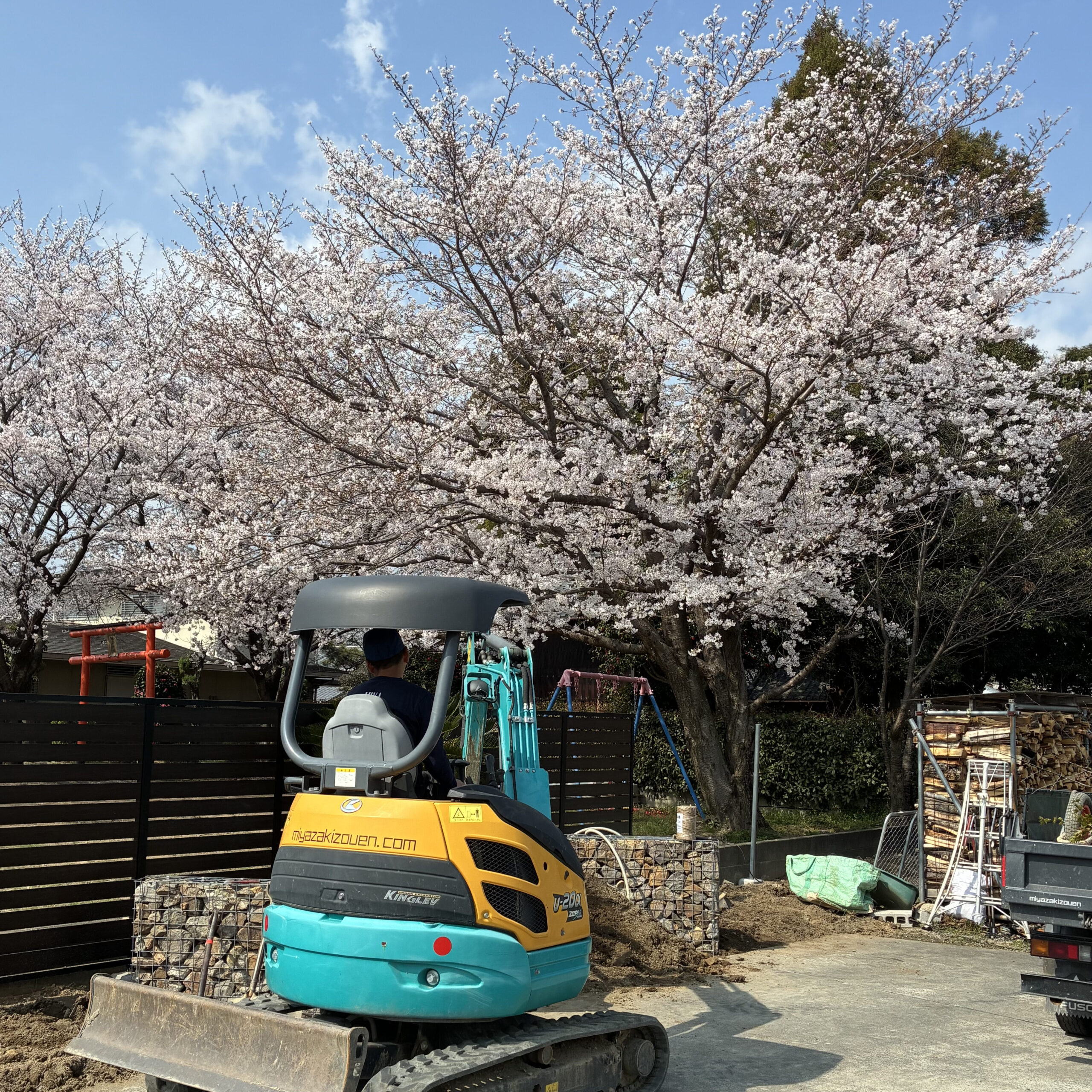 今週はドライガーデンの植栽工事。咲き誇る桜の木のもとで、桜の木も景色として考慮しながら工事を進めました。