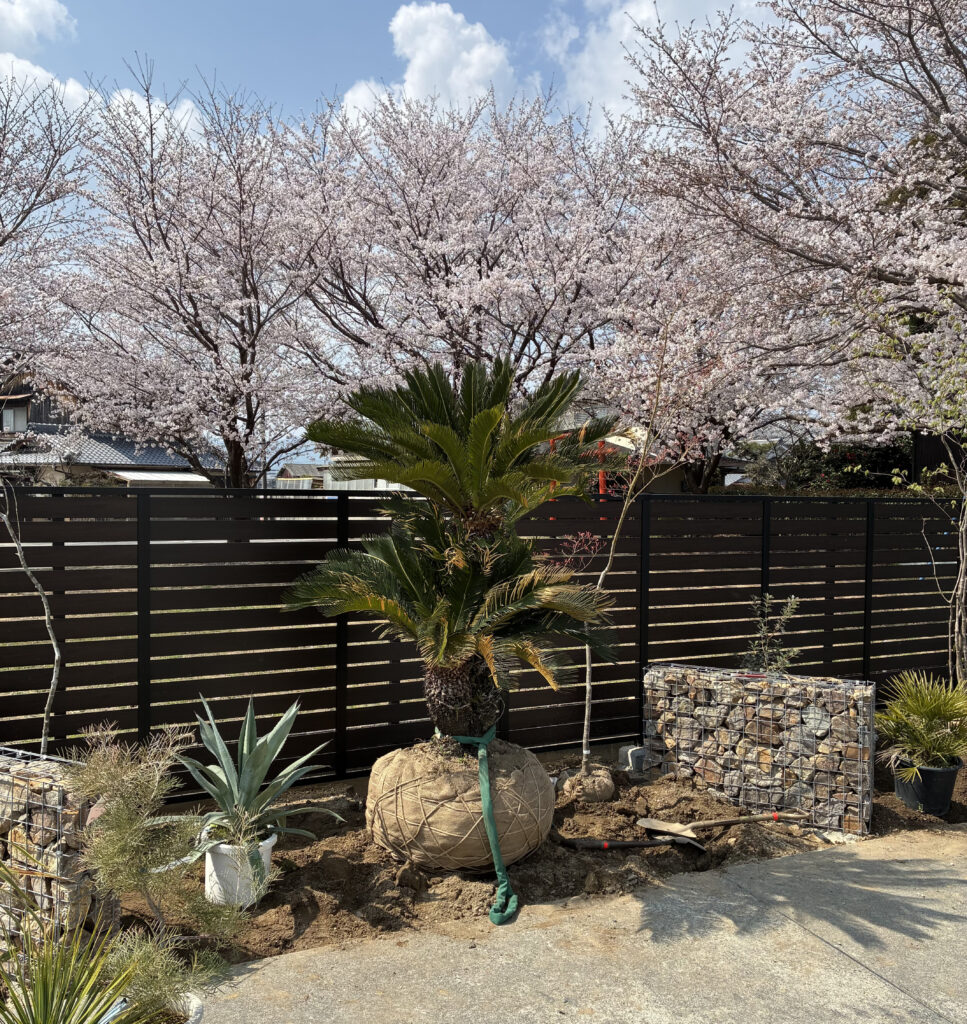 今回は既存の大きなソテツをシンボルとしてアガベやユッカを点在させ、高木のモミジやアオダモなどのナチュラルな雰囲気も組み合わせながら宮崎造園らしい特徴的なNIWAを目指しました。