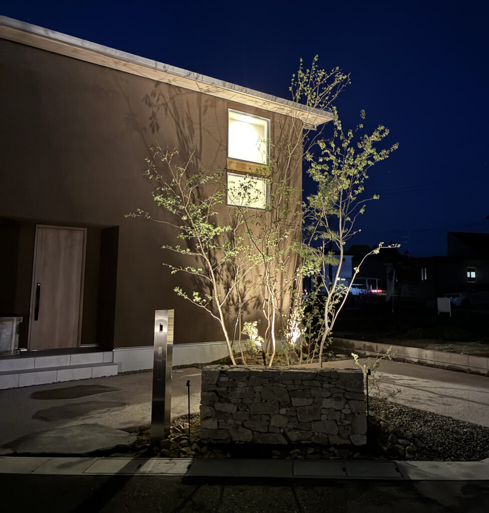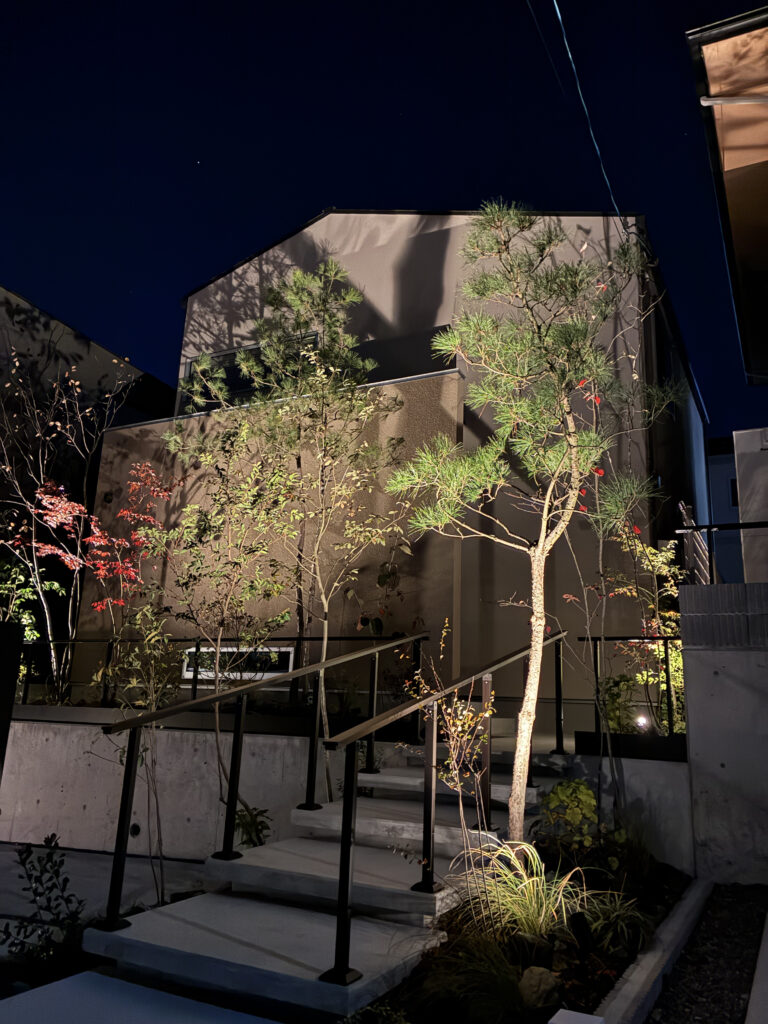 造園外構工事の最後に行うライティングチェック。照明を設置することで植栽は日中だけでなく夜も楽しむことができます。今回は高さのある植栽が揃う物件。シンプルでモダンな外観の住宅に木々の影が映し出されると日中とは違った表情が現れます。